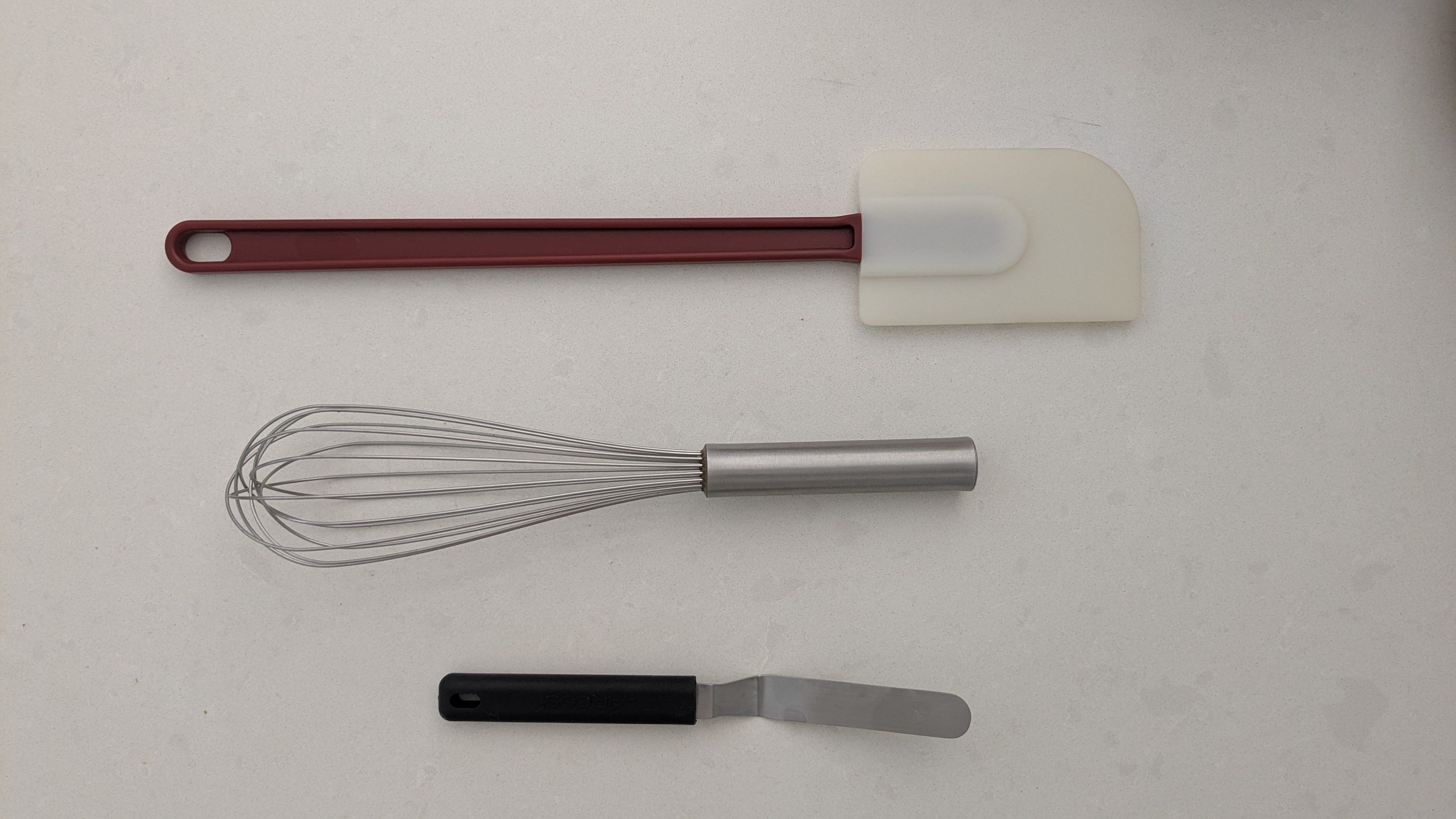 I’m admittedly cheating a bit with this one, because it’s actually three in one, but these hand tools basically go together: a whisk; a silicone spatula; and a little off-set spatula.